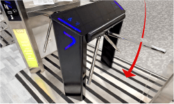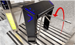 Sensors detect crawling under the turnstile arm and activate an audio alarm to prevent unauthorized access to the area.
